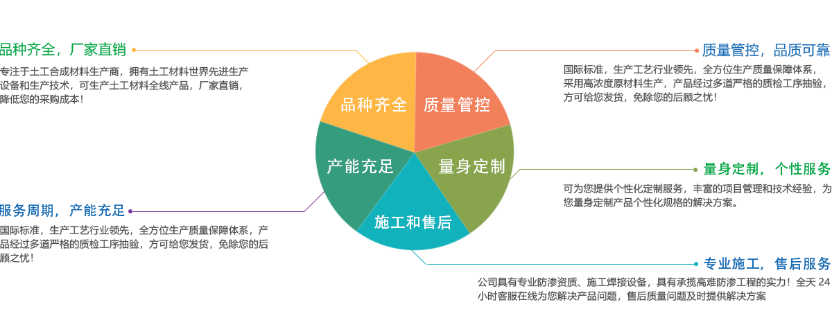 公司所有產(chǎn)品均采用國際標(biāo)準(zhǔn)組織生產(chǎn),并經(jīng)國家、市技術(shù)監(jiān)督局采標(biāo)驗收,生產(chǎn)工藝及水平全國領(lǐng)先,屬國內(nèi)優(yōu)等水平,實物質(zhì)量達到國際先進水平。經(jīng)用戶、施工單位使用證明,質(zhì)量穩(wěn)定可靠、施工方便、價格合理、售后服務(wù)完善。產(chǎn)品主要應(yīng)用于農(nóng)業(yè)、海綿城市建設(shè)、公路、鐵路、垃圾填埋場防滲,水利、電力、水土保持及環(huán)境綠化與基礎(chǔ)建設(shè)領(lǐng)域,已被廣泛應(yīng)用于高速公路、鐵路、垃圾填埋場等多項國家重點工程,受到工程界專家及廣大用戶的一致好評。